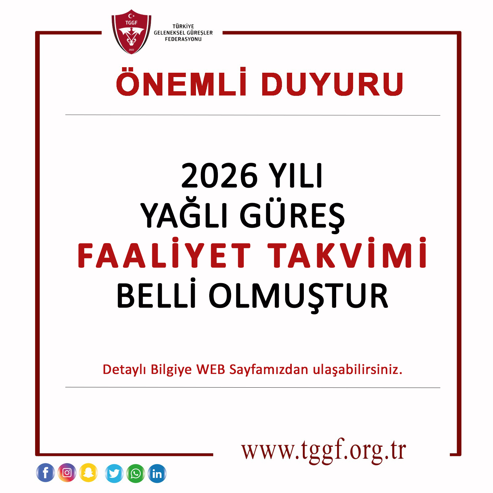 YAĞLI GÜREŞ 2026 YILI FAALİYET TAKVİMİ