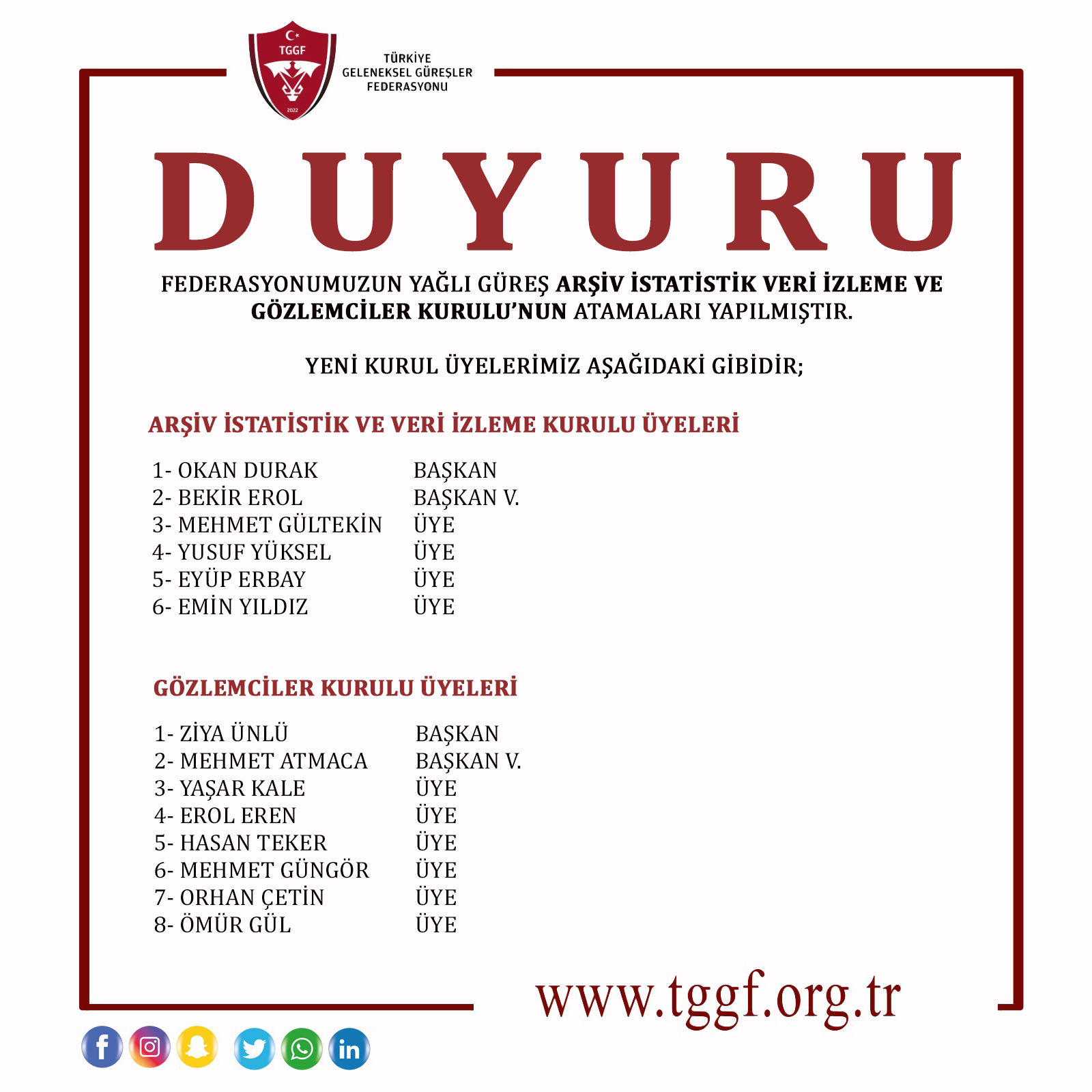 YAĞLI GÜREŞ ARŞİV İSTATİSTİK VE GÖZLEMCİLER KURULU YENİ ATAMALAR