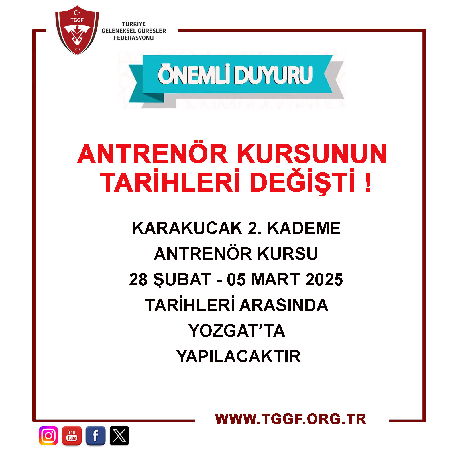 * Kurs kontenjanı 50 kişi ile sınırlıdır, kursa başvurularda kurs kontenjanının maksimum iki katı başvuru alınacaktır. Başvuru sayısı fazla olduğu durumlarda Türkiye Geleneksel Güreşler Federasyonu Antrenör Eğitim Talimatında belirtilen şartları taşıyan kursiyerlere öncelik verilecektir.