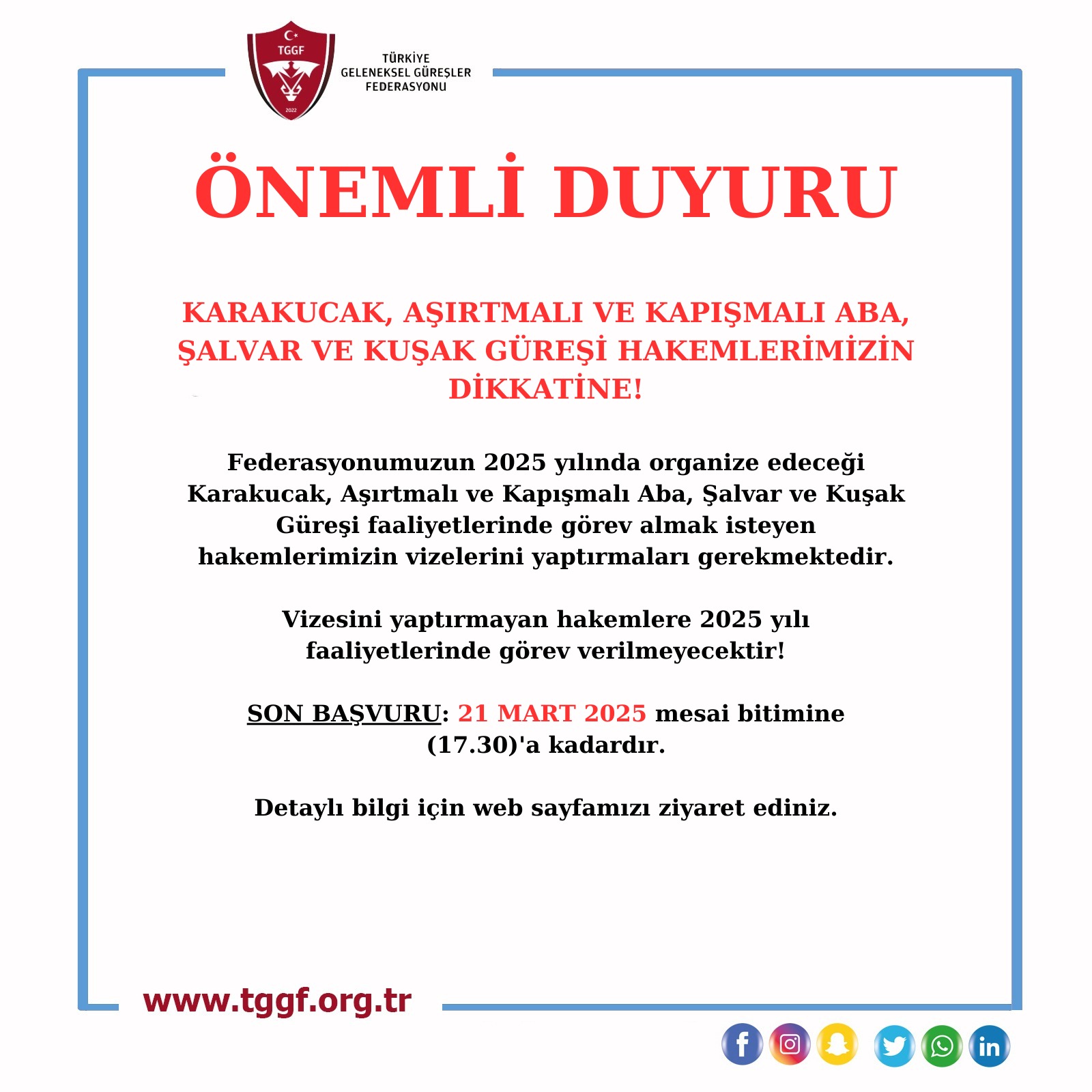 Federasyonumuzun 2025 yılında organize edeceği Karakucak, Aşırtmalı ve Kapışmalı Aba, Şalvar ve Kuşak Güreşi faaliyetlerinde görev almak isteyen hakemlerimizin vizelerini yaptırmaları gerekmektedir.