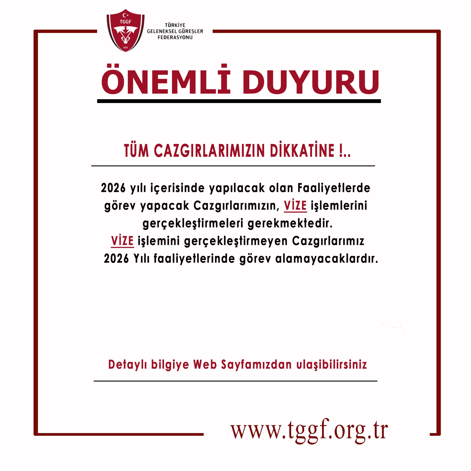 2026 yılı içerisinde Federasyonumuzca ve İllerde yapılacak olan faaliyetlerde görev yapacak Cazgırlarımız 2026 yılı VİZE işlemlerini gerçekleştirmeleri gerekmektedir.