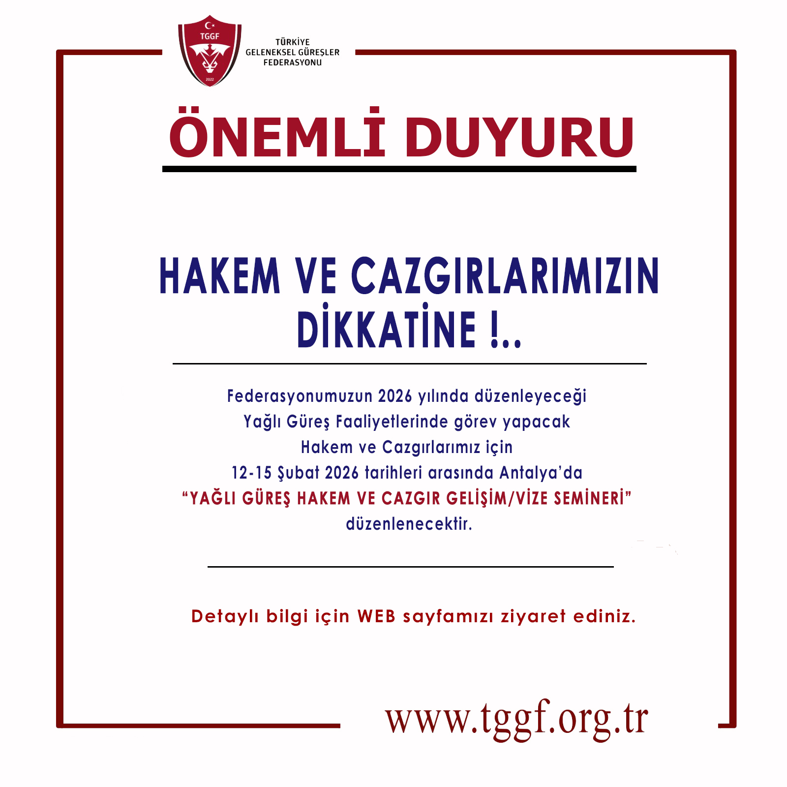 Federasyonumuzun 2026 yılında düzenleyeceği Yağlı Güreş Faaliyetlerinde görev yapacak hakem ve cazgırlarımız için 12-15 Şubat 2026 tarihleri arasında Antalya’da “YAĞLI GÜREŞ HAKEM VE CAZGIR GELİŞİM VE VİZE SEMİNERİ” düzenlenecektir.
