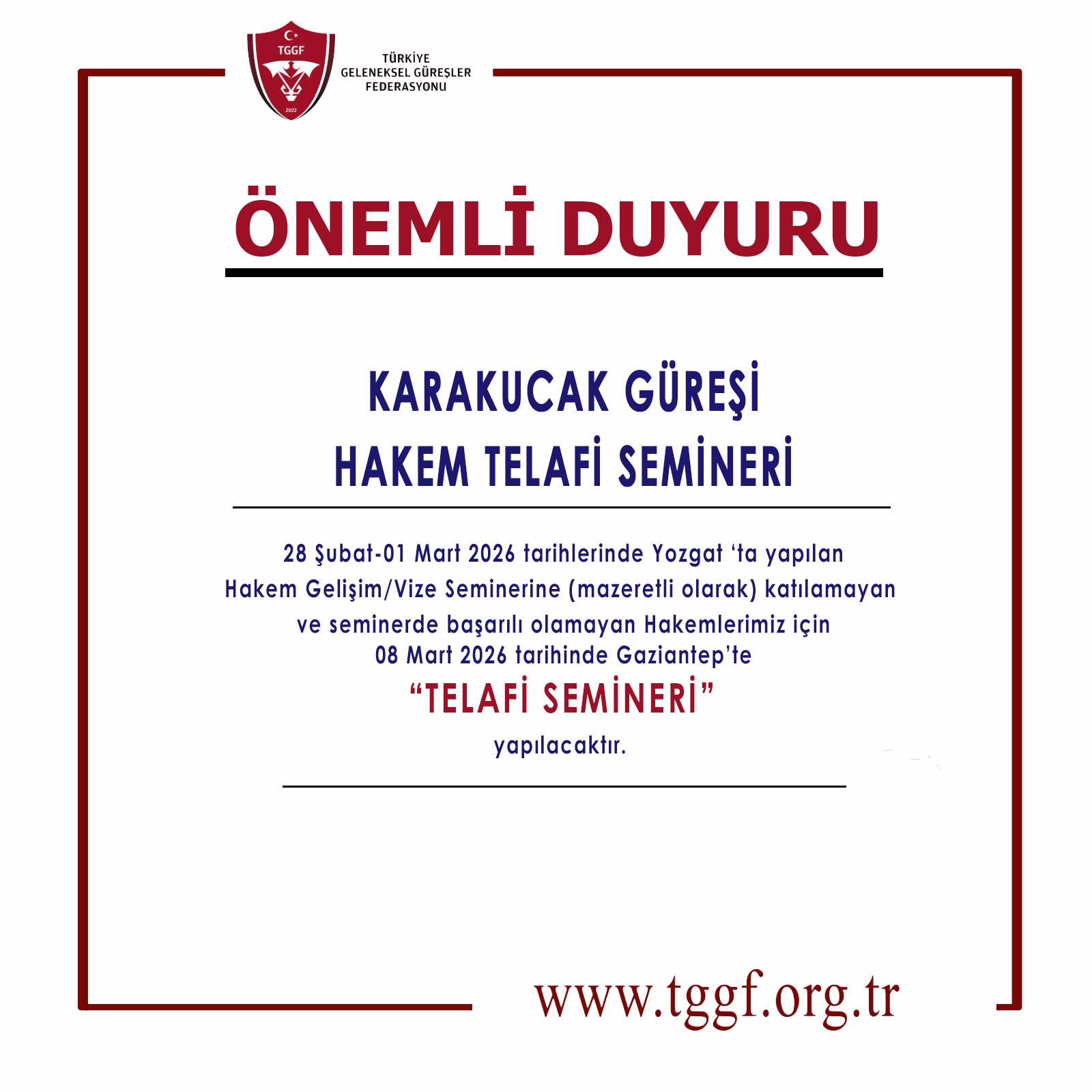 28 Şubat-01 Mart 2026 tarihlerinde Yozgat ‘da yapılan Hakem Gelişim/Vize Seminerine (mazeretli olarak) katılamayan ve seminerde başarılı olamayan Hakemlerimiz için 08 Mart 2026 tarihinde Gaziantep’te “TELAFİ SEMİNERİ” yapılacaktır.