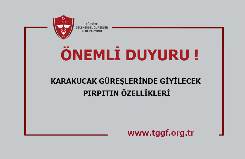 Karakucak Güreşlerine Katılacak olan sporcuların Türkiye Geleneksel Güreşler Federasyonu Karakucak Güreşi Müsabaka Talimatının 31.Maddesi gereği deri olmayan, kalın kumaştan hazırlanmış beli lastikli ve kasnaklı olmayan ayakları paça bağı ile bağlanabilecek giysiyi giymeleri gerekmektedir. Bu şartlara uymayan pırpıtlar geçersiz olup müsabakalarda kullanılmasına izin verilmeyecektir!