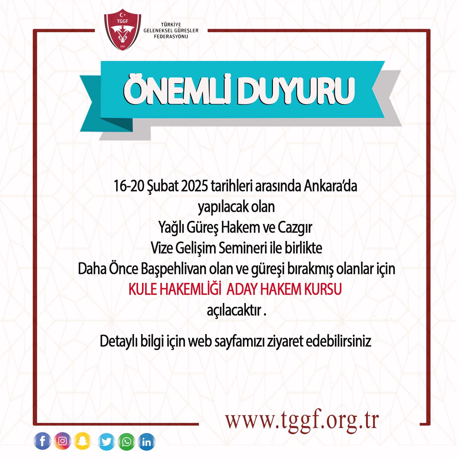 16-20 Şubat 2025 tarihinde Ankara ‘da yapılacak olan Yağlı Güreş Hakem ve Cazgır Gelişim Semineri ile birlikte Başpehlivanlığı bırakmış olanlar için “Kule Hakemliği Aday Hakem Kursu” açılacaktır.