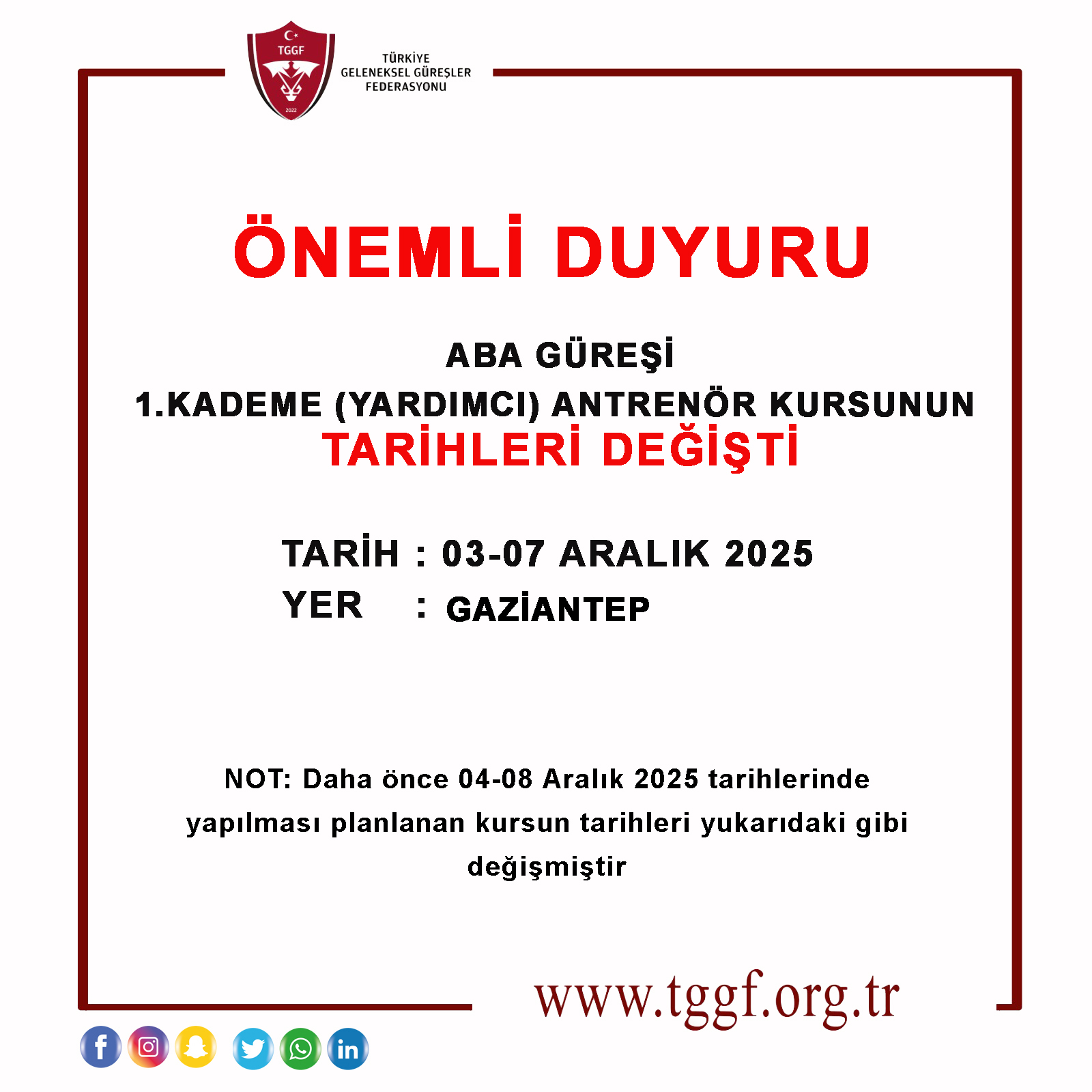 Gaziantep’te 04-08 Aralık 2025 tarihlerinde yapılacağı duyurulan, ABA GÜREŞİ 1.Kademe Antrenör Kursunun tarihleri değişmiş olup, diğer planlamalarda ve şartlarda herhangi bir değişiklik yapılmamıştır.