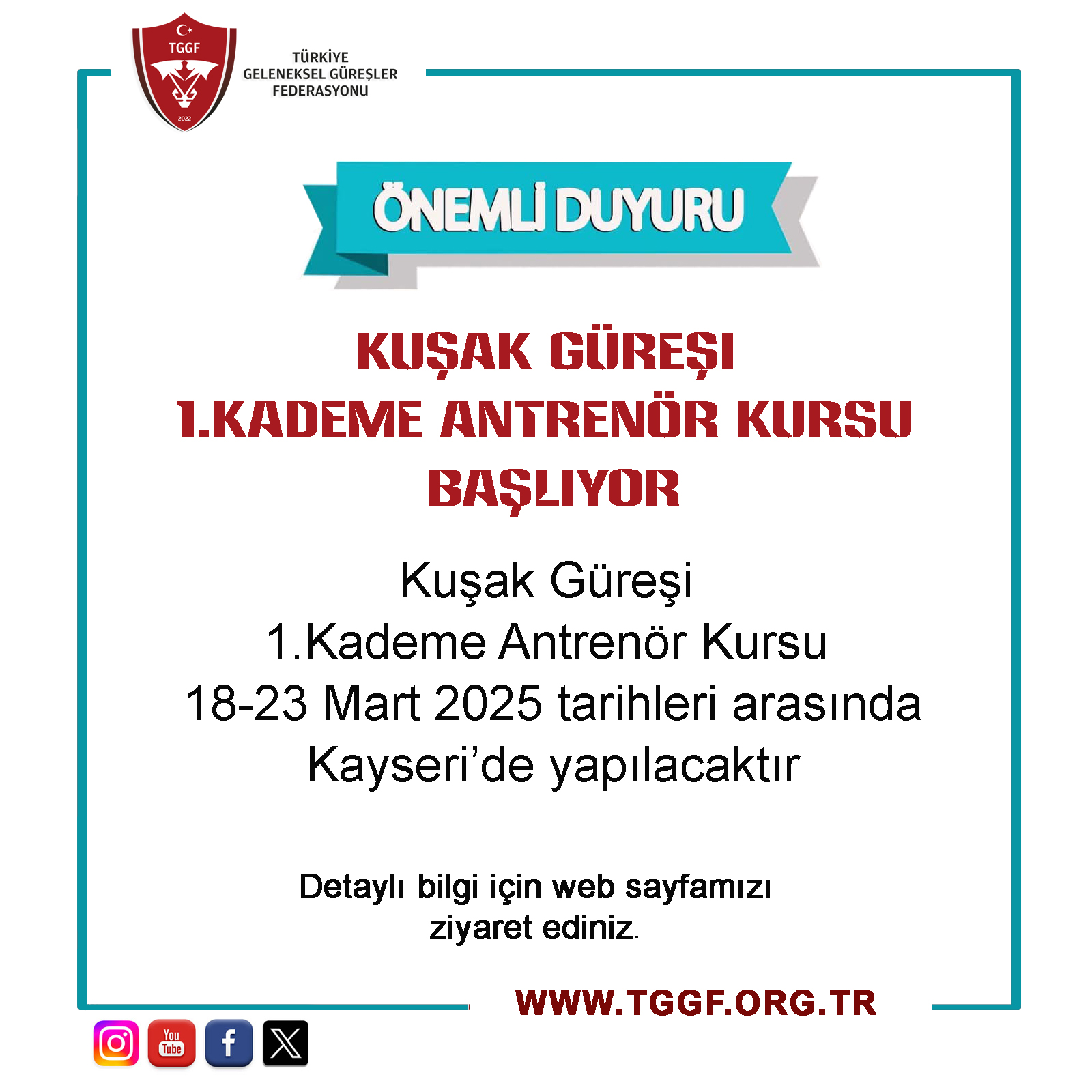- Kurs kontenjanlarının dolması halinde ileri tarihlerde de kademeler için uygulama eğitimi kursları açılmaya devam edilecektir. Duyurular federasyonumuzun resmi internet adresinden yapılacaktır.