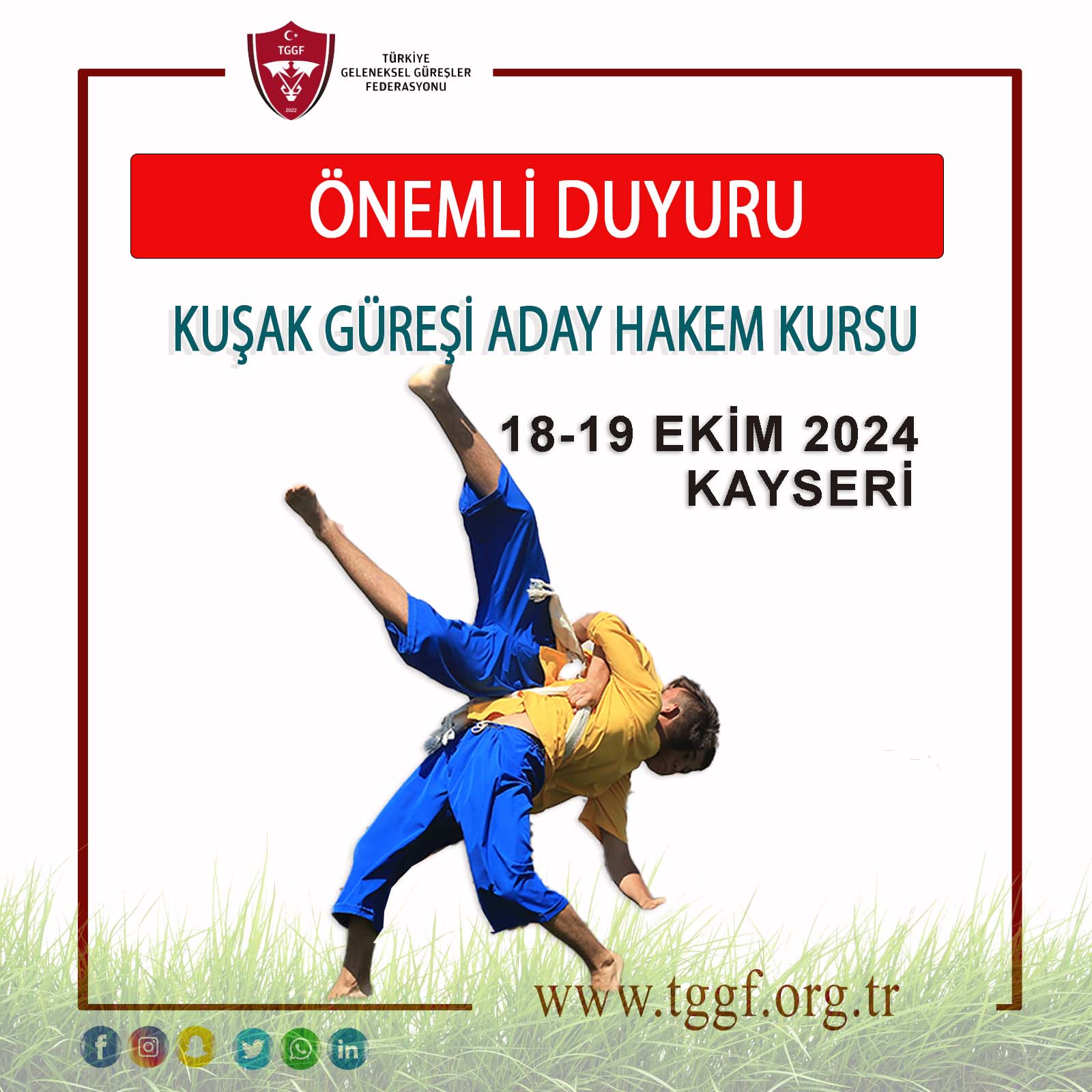 Federasyonumuzca 18-19 Ekim 2024 tarihleri arasında Kayseri ilinde KUŞAK GÜREŞİ ADAY HAKEM KURSU açılacaktır.