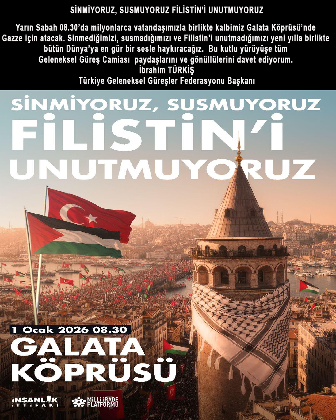 Yarın Sabah 08.30’da milyonlarca vatandaşımızla birlikte kalbimiz Galata Köprüsü’nde Gazze için atacak. Sinmediğimizi, susmadığımızı ve Filistin’i unutmadığımızı yeni yılla birlikte bütün Dünya’ya en gür bir sesle haykıracağız.