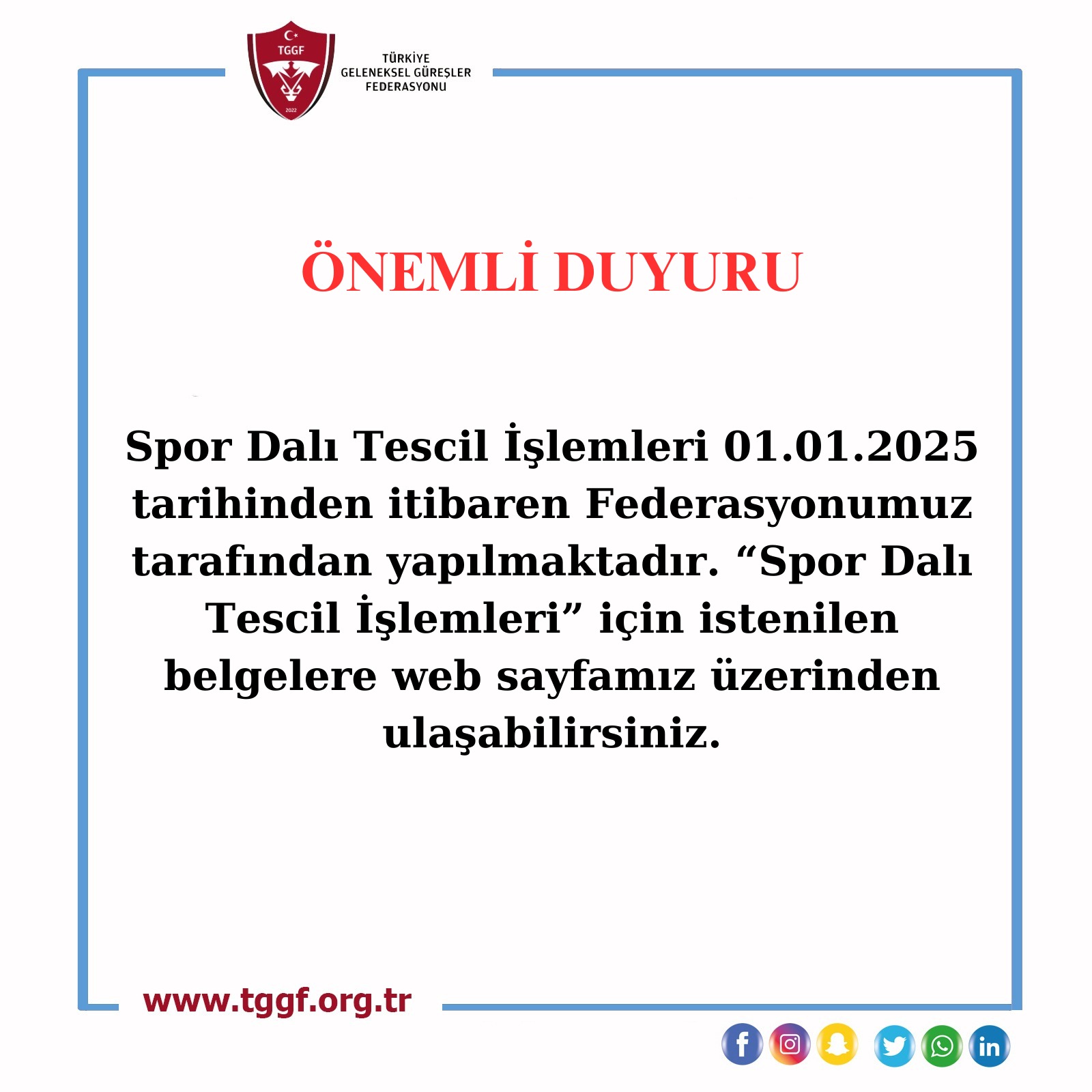 Bilindiği üzere; daha önce Gençlik ve Spor İl Müdürlükleri tarafından yapılmakta olan Spor Dalı Tescil İşlemleri, 01.01.2025 tarihinden itibaren federasyonumuz tarafından yapılmaktadır. “SPOR DALI TESCİL İŞLEMLERİ” için istenilen belgeler aşağıdaki gibidir.