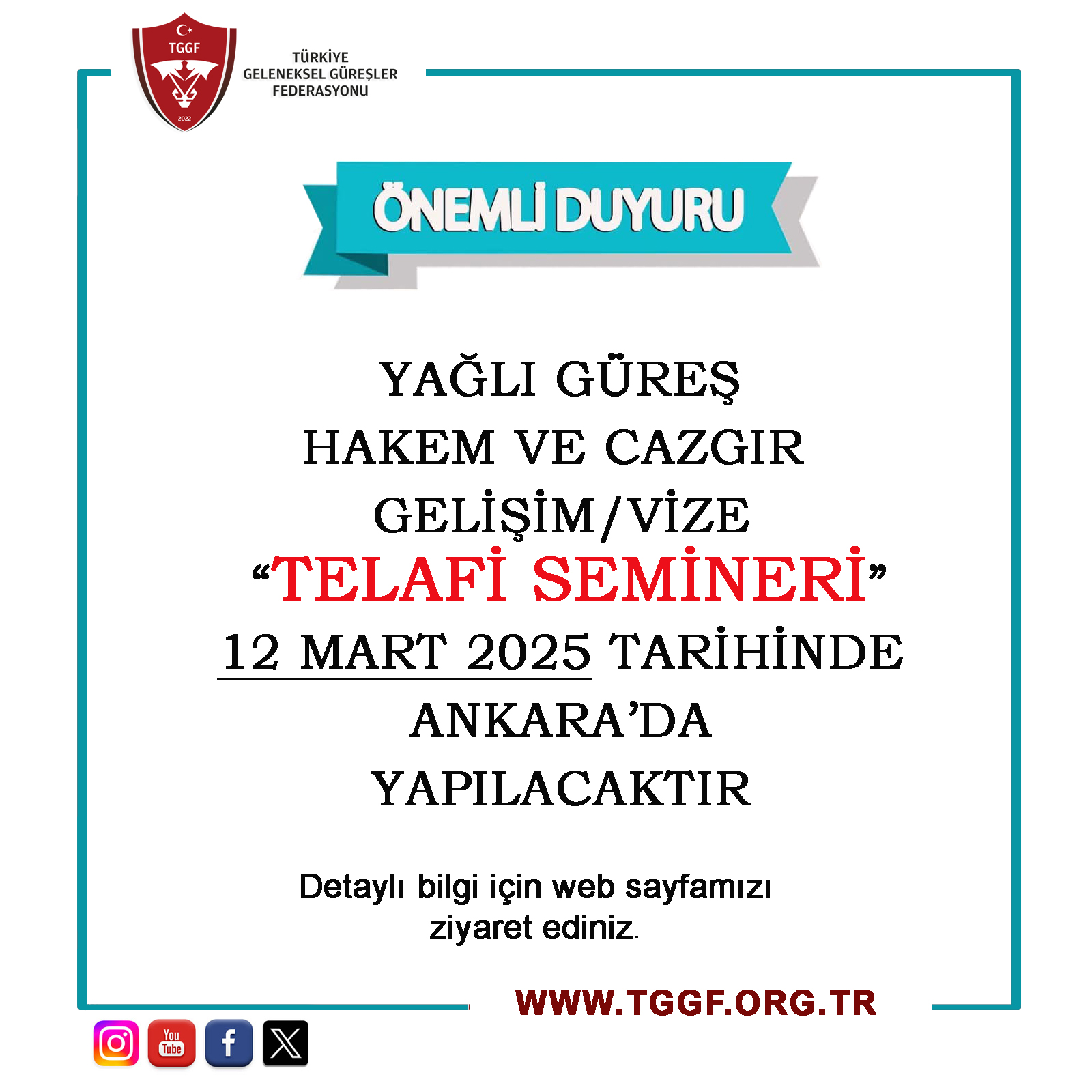 16-20 Şubat 2025 tarihleri arasında Ankara/Kızılcahamam’da yapılan Yağlı Güreş Hakem ve Cazgır Gelişim/Vize Seminerine mazeretli şekilde katılamayan ve başarısız olanlar hakemlerimiz için “TELAFİ SEMİNERİ” 12 Mart 2025 tarihinde Ankara’da yapılacaktır.