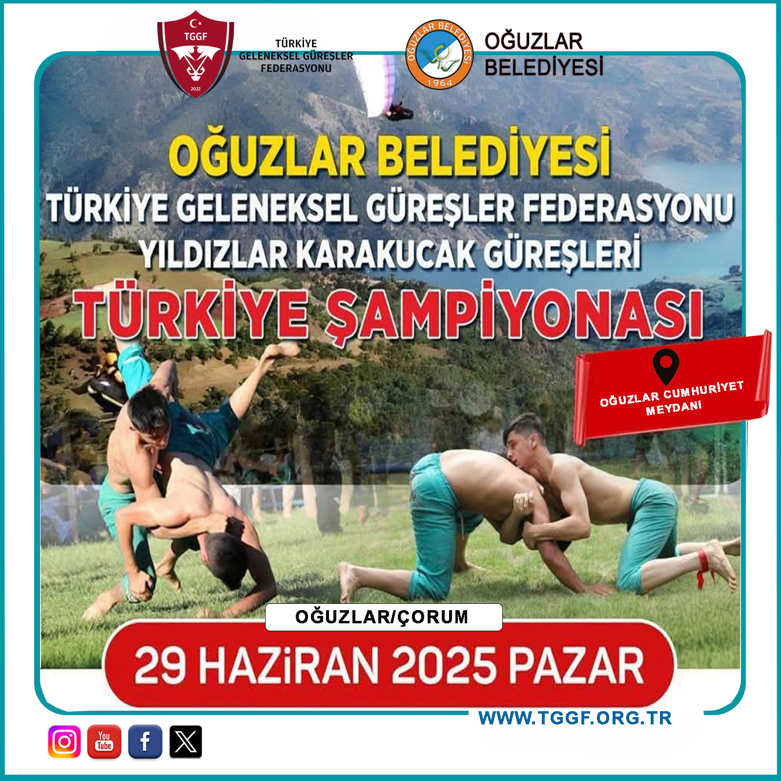 Yıldızlar Karakucak Güreşi Türkiye Şampiyonası, Oğuzlar Belediyesi tarafından 29 Haziran 2025 tarihinde Çorum’da yapılacaktır.
